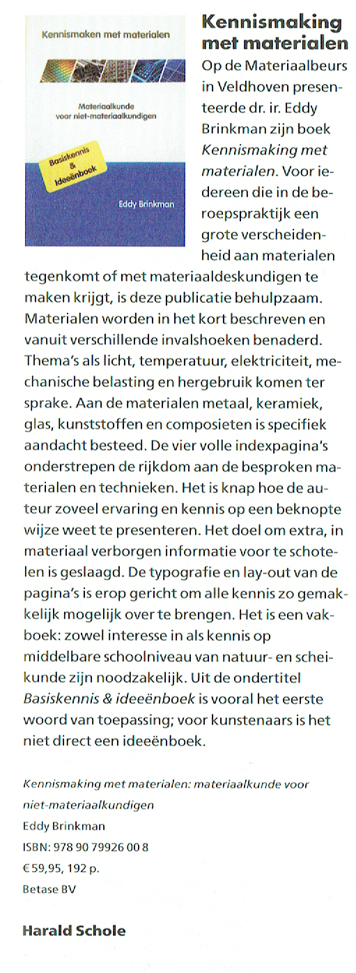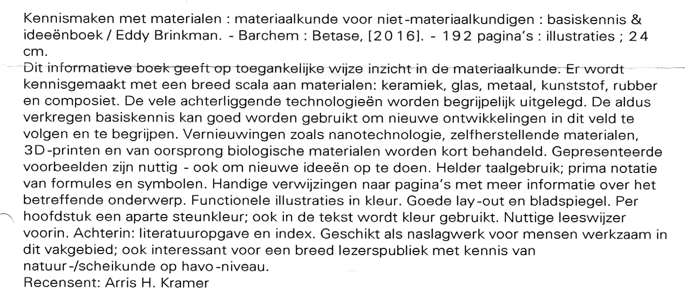 Sinds het verschijnen van het boek ‘Kennismaken met materialen’ in april 2016 hebben diverse organisaties een recensie over dit boek geschreven, elk met hun eigen doelgroep in het achterhoofd. Op deze webpagina vindt u hun recensies terug. Klik op de afbeelding van de recensie om deze als grotere afbeelding te kunnen bekijken.